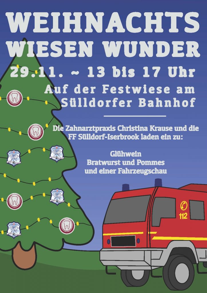 Es ist wieder soweit: der Weihnachtsbaum für Sülldorf wird auf dem Festplatz errichtet! Zusammen mit der Zahnarztpraxis Christina Krause laden wir herzlich zum geselligen Beisammensein im Op’n Hainholt/Sülldorf Kirchenweg ein. Bei Heißgetränk und Bratwurst möchten wir gemeinsam den Weihnachtsbaum einweihen. Eine Fahrzeugschau wird es ebenfalls geben. Wir freuen uns auf Euch!